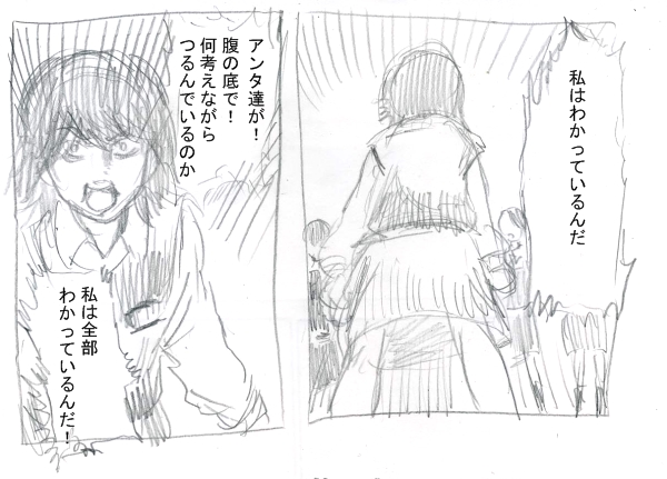 女子グループはそれを見てクスクスと遠巻きに笑っていた。「あいつ、何探してるの?」「しらなーい」「ゆっち隠したんじゃないの?」「えー?あいつの机とかキショくて触れないでしょ」